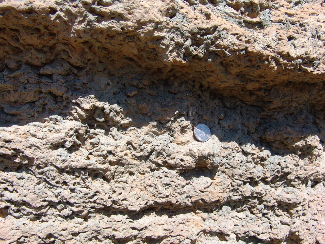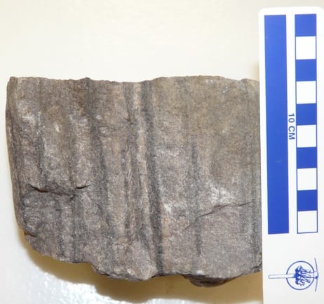 Snowball or Slushball Earth has had an impact on paleontology as well. One characteristic of Proterozoic sediments is that they contain almost no fossils. During the next time period, the Cambrian, there is a dramatic increase in the number of fossils, both the organisms themselves and their traces; this event is referred to as the “Cambrian Explosion”. (See the comparative images below.) Almost all the major phyla of animals first appear in the fossil record at this time. It may be that organisms were evolving in relatively isolated deep-sea environments (which don’t preserve in the rock record), and with the end of Snowball conditions they were able to rapidly move into shallow-water environments for the first time.