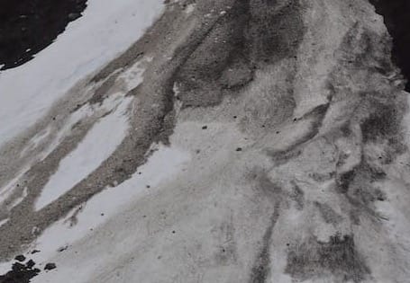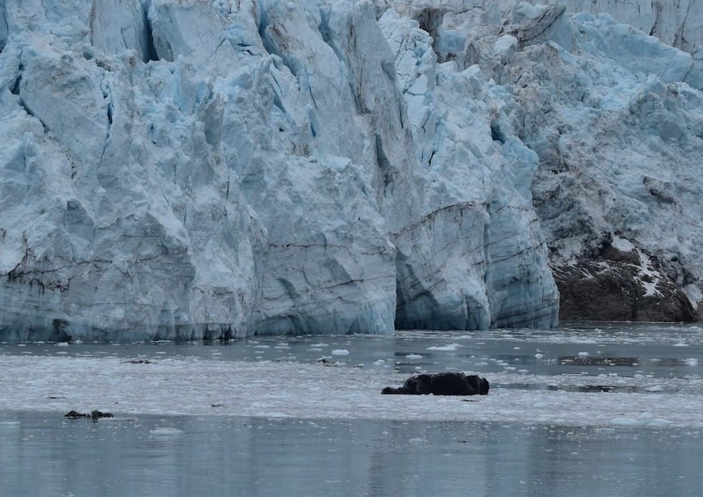 When glaciers move across the landscape they grind up a lot of rock, as can be seen in the Alaskan glacier shown above. Much of that ground-up rock ends up embedded in the glacier itself. When the glacier reaches the ocean, pieces of it break off to form icebergs which float away, occasionally running into ships but more often just floating off to warmer waters where they eventually melt. Many of those iceberg will include some of the gravel from the glacier. In the image below, sediment rich streaks are visible in the glacier in the background, while the the dark blobs in the foreground are gravel-rich icebergs.