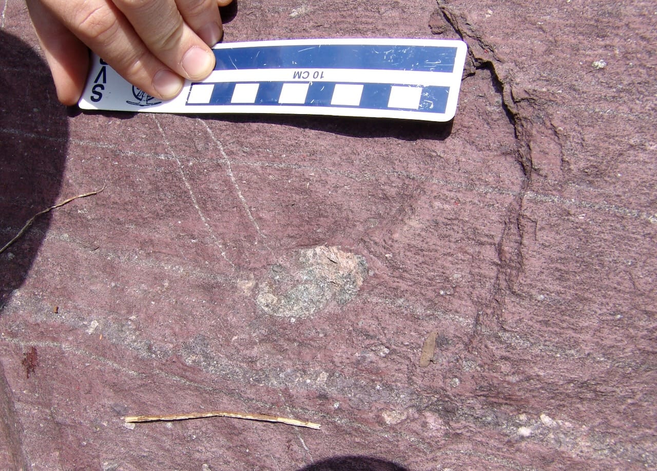 This particular dropstone is in the Konnarock Formation, a rock unit near Mt. Rogers in Virginia. The Konnarock was deposited in the late Proterozoic Eon, between 760 and 570 million years ago. It’s thought that, at that time, Virginia was pretty close to the equator.