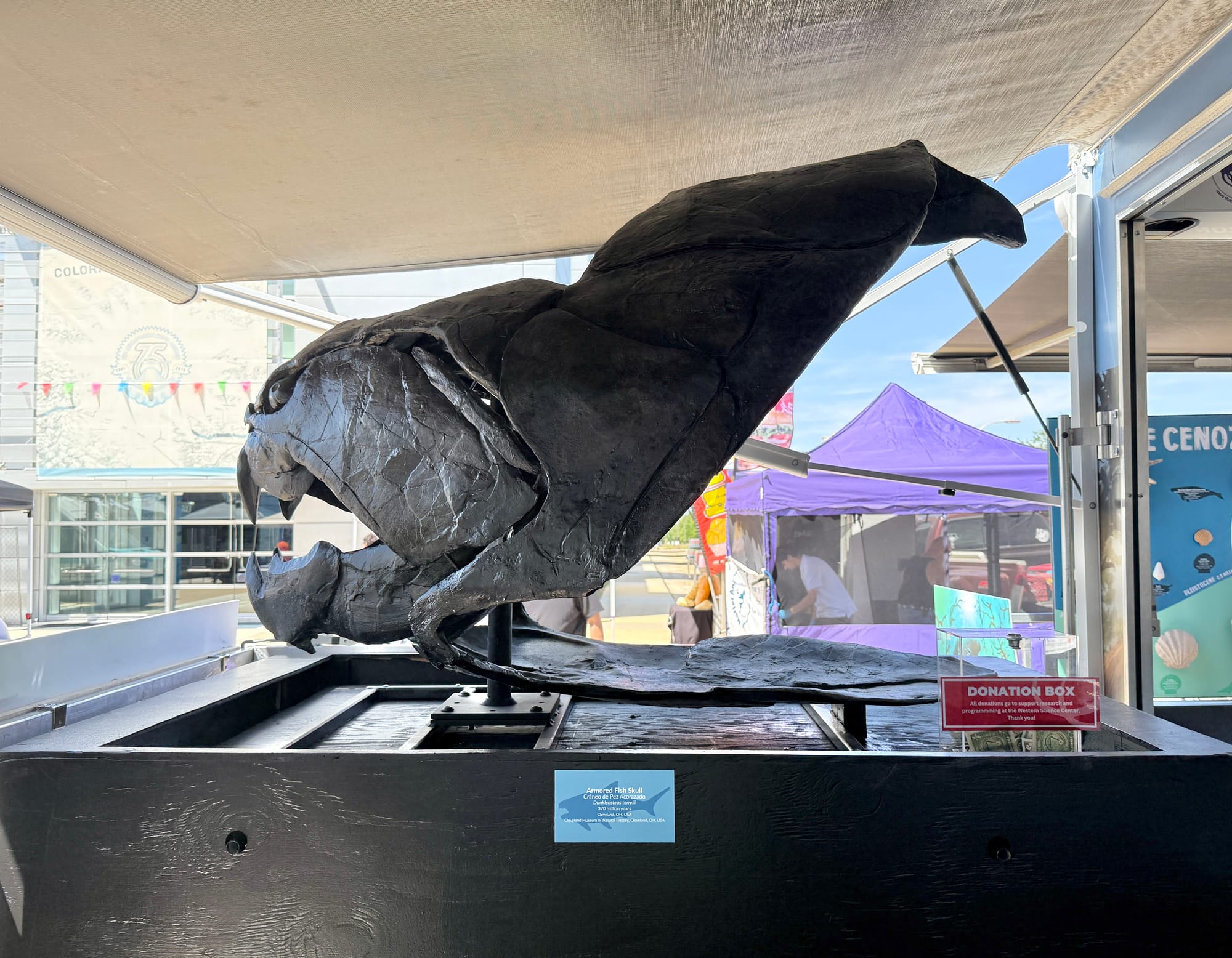 Our first design challenge for this exhibit was the initial draw. Our other M3 displays all feature Max; his huge skull and tusks are visible from a distance and pull visitors in at busy events. But of course Max wouldn’t be in a sea life exhibit; we needed some imposing replacement. We eventually settled on the Cleveland Museum of Natural History’s skull of Dunkleosteus terrelli, a huge Devonian placoderm fish from Ohio (Dunk‘s skull is actually larger than Max’s skull with the tusks removed). Casts of this skull are produced by Research Casting International: