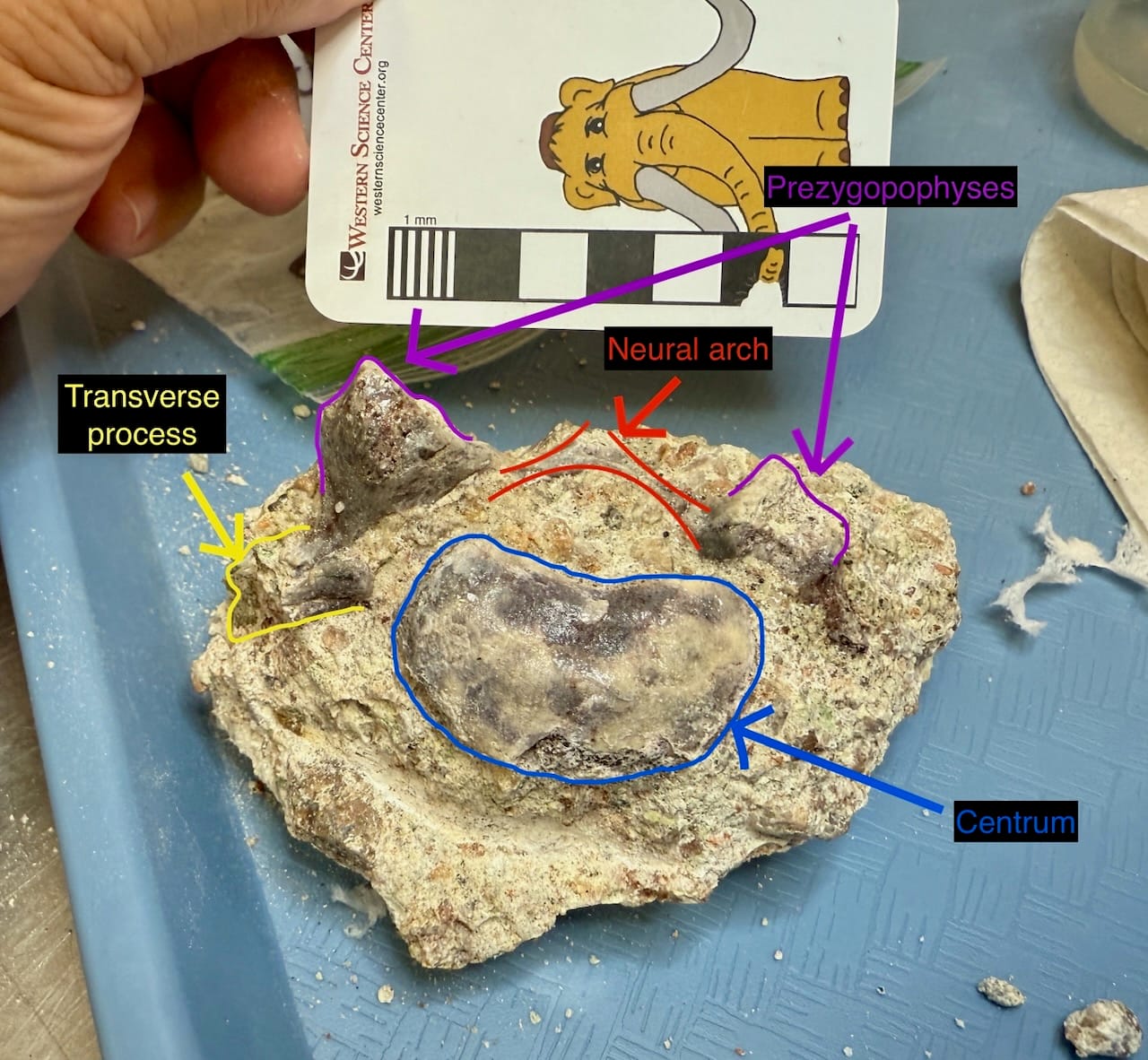 The vertebra is shown in anterior view, with dorsal toward the top of the image. The main body of a vertebra is called the centrum, which here is outlined in blue. The neural arch sits on top of the centrum; the gap between the arch and the centrum forms a tunnel called the neural canal, which held the spinal cord (in this fossil it's still filled with sediment). The prezygopophyses project forward and would have articulated with the vertebra in front of this one. The transverse processes, only one of which is preserved, stick out to the side and articulated with the ribs.
