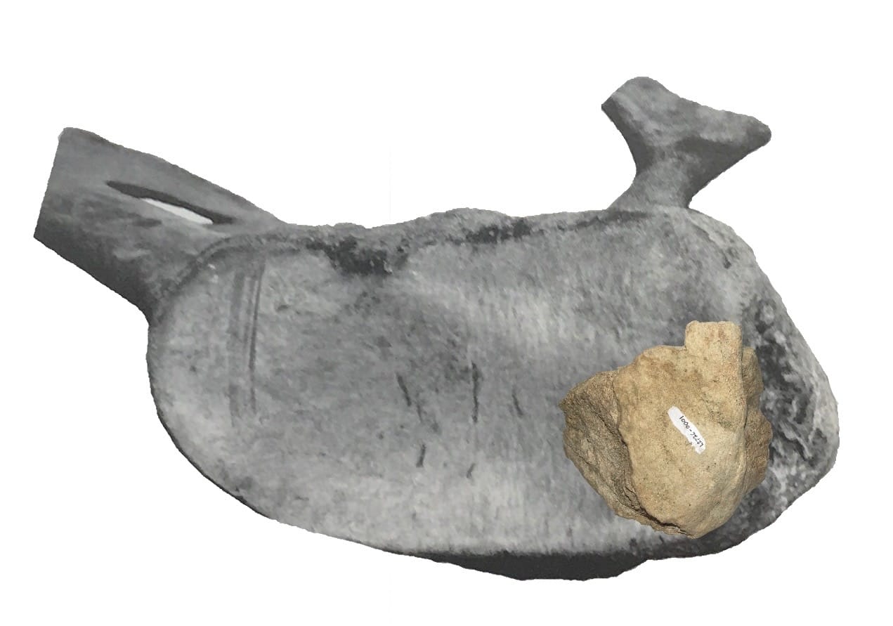 It turns out that this fragment is part of the shoulder socket from the right scapula of a proboscidean. In 1998, paleontologist Eric Scott recognized that it came from a large mastodon (shown below superimposed on an image from Olsen 1972):