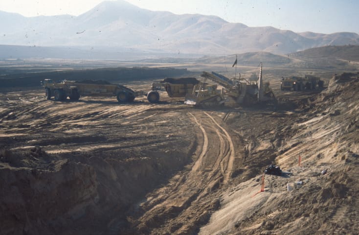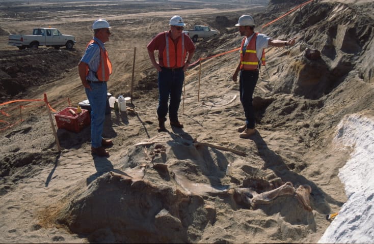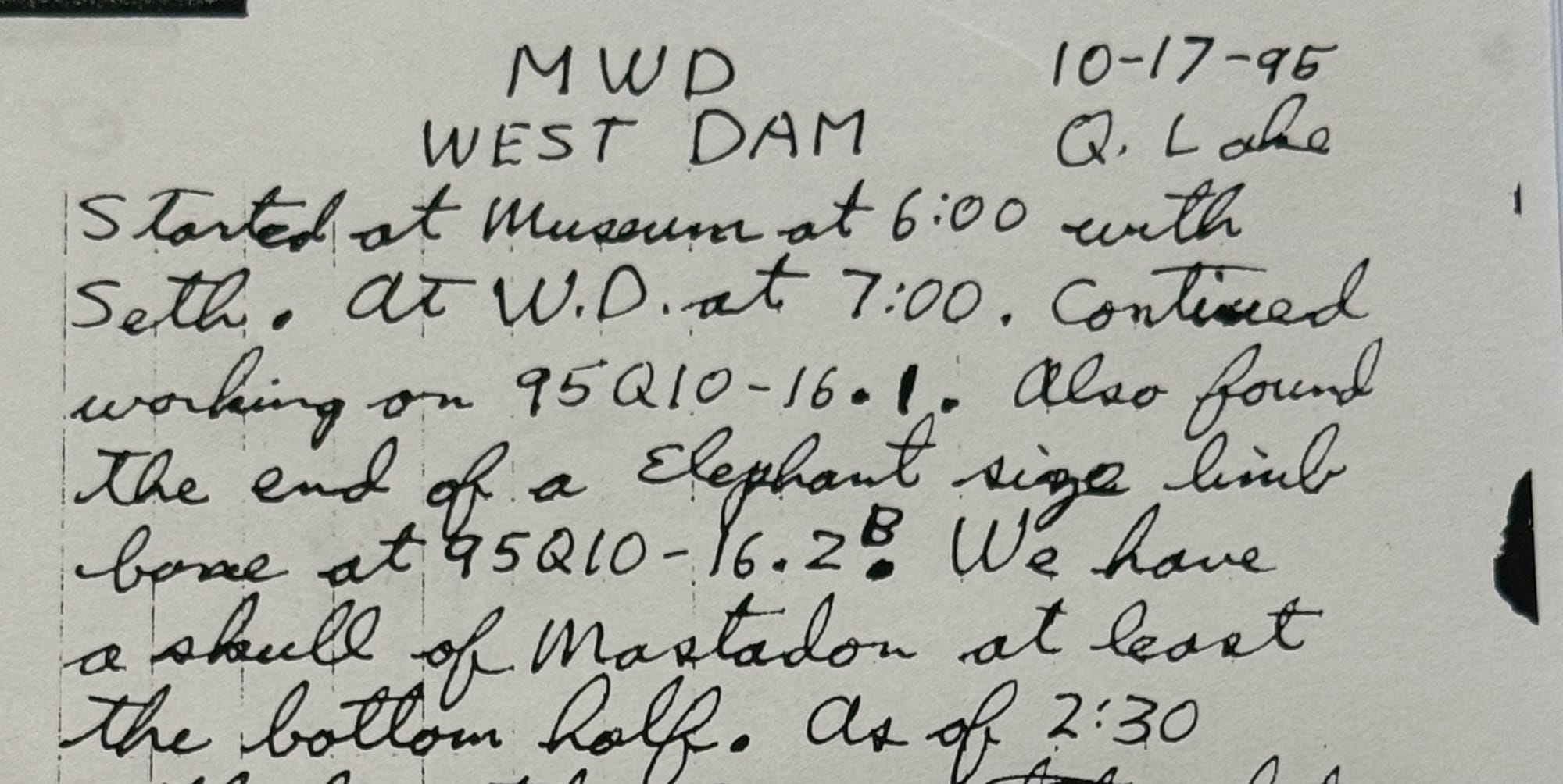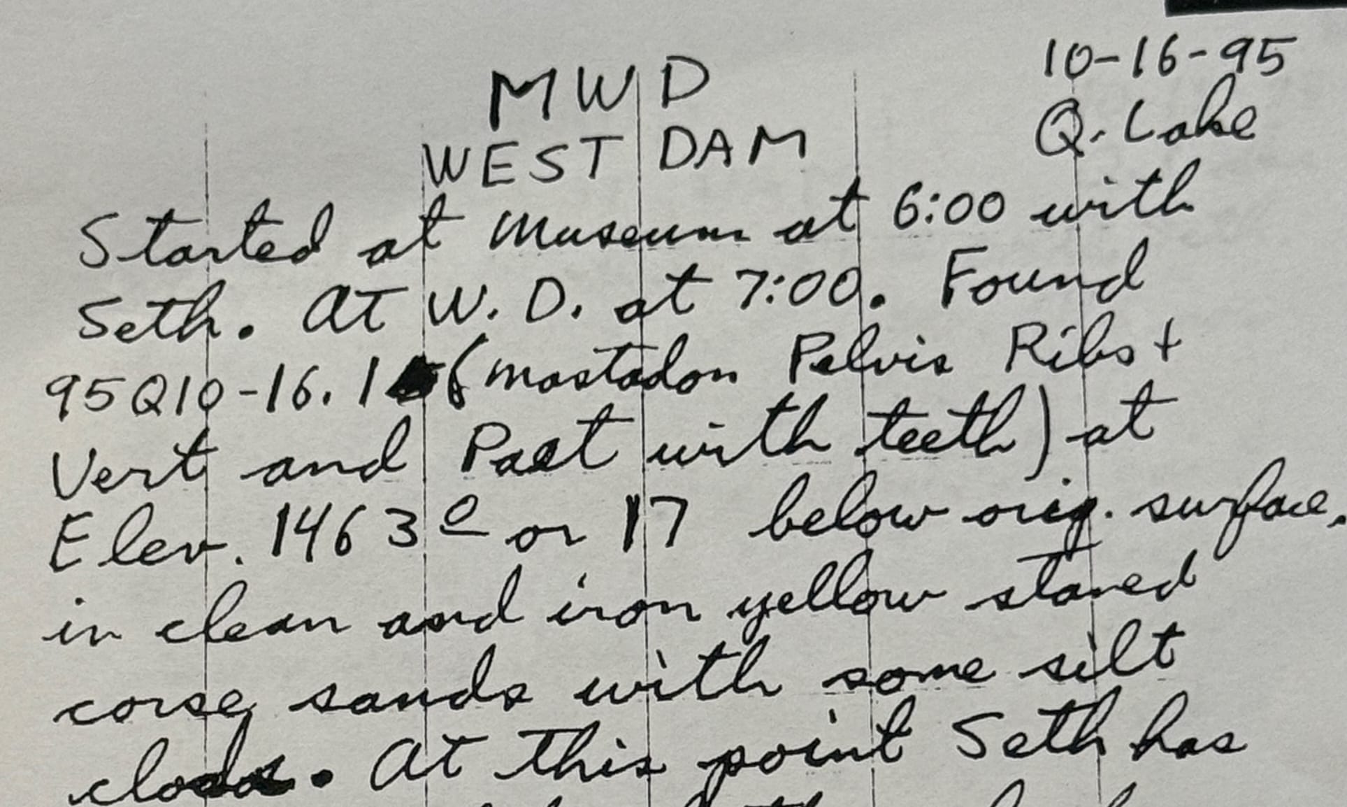 By 1995 the multiyear Diamond Valley Lake construction project was well underway. Huge amounts of sediment had to be moved to both increase the reservoir's volume and to provide the raw materials that would be used to construct the three required dams. Each morning teams of archaeologists and paleontologists would drive out to active construction sites, monitoring the sediment removal for any hint of artifacts or fossils that needed to be documented and removed. Whenever fossils were found, the site location would be mapped and described, a field number would be assigned, and the fossils would be removed as quickly as possible.